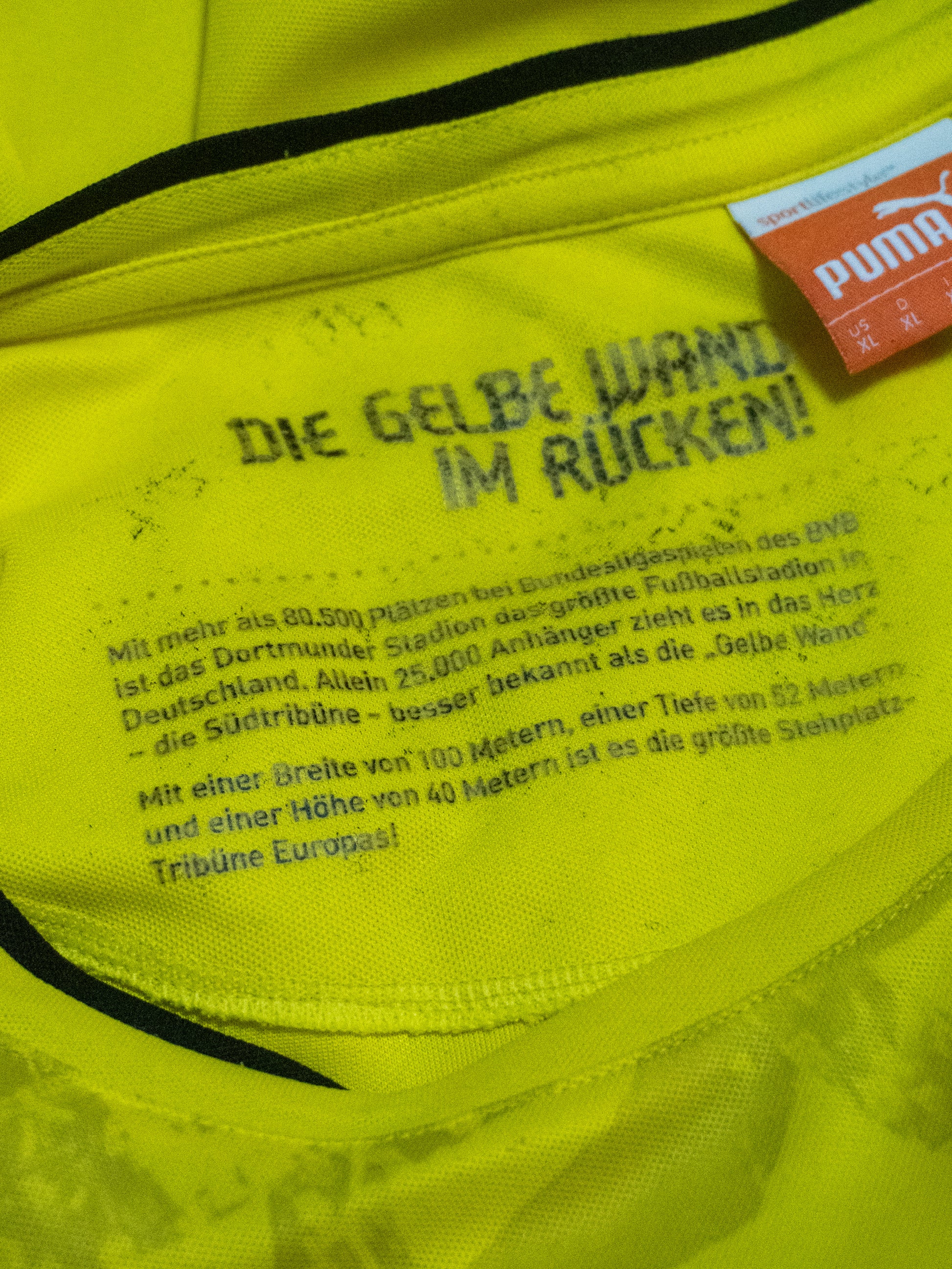 Borussia Dortmund Special Trikot aus der Saison 2013/14. "Die Gelbe Wand im Rücken" Text im Nacken gedruckt. Getragen wurde das Trikot unter anderem von Marco Reus, Mats Hummels und Robert Lewandowski.